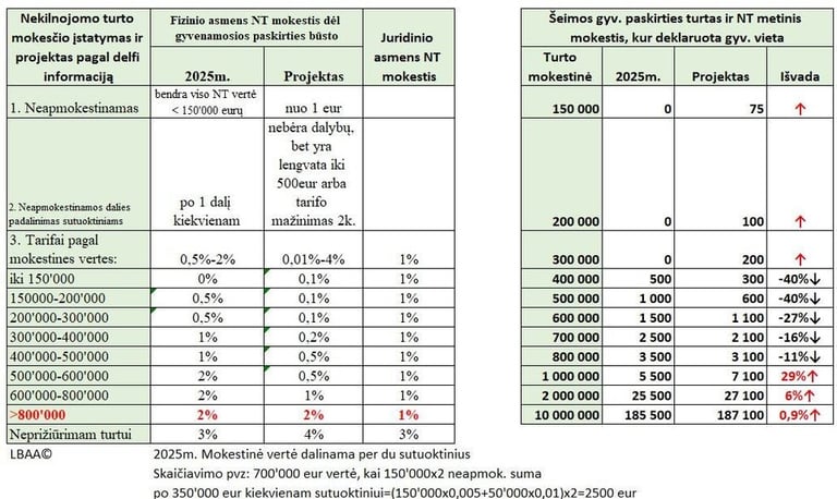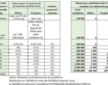 Šiuo metu nekilnojamasis turtas (NT) apmokestinamas tik tada, kai jo vertė viršija 150 tūkst. eurų. Jei NT kainuoja nuo 150 tūkst. iki 300 tūkst. eurų, taikomas 0,5 proc. tarifas, nuo 300 tūkst. iki 500 tūkst. eurų – 1 proc., o viršijus 500 tūkst. eurų – 2 proc. Tačiau planuojama keisti šį modelį: naujajame projekte numatoma, kad net ir mažiausios vertės NT būtų apmokestinamas. Siūloma taikyti 0,1 proc. tarifą nuo pirmojo NT euro iki 300 tūkst. eurų, 0,2 proc. – nuo 300 tūkst. iki 400 tūkst. eurų, 0,5 proc. – nuo 400 tūkst. iki 600 tūkst. eurų, 1 proc. – nuo 600 tūkst. iki 800 tūkst. eurų, o turtui, kurio vertė viršija 800 tūkst. eurų, būtų taikomas 2 proc. tarifas.